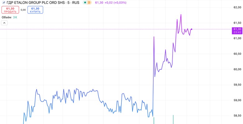 На максимуме расписки подорожали до 62,3 руб. Уже к 17:35 мск рост замедлился до 3,76%, расписки торговались по 61,2 руб.